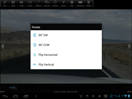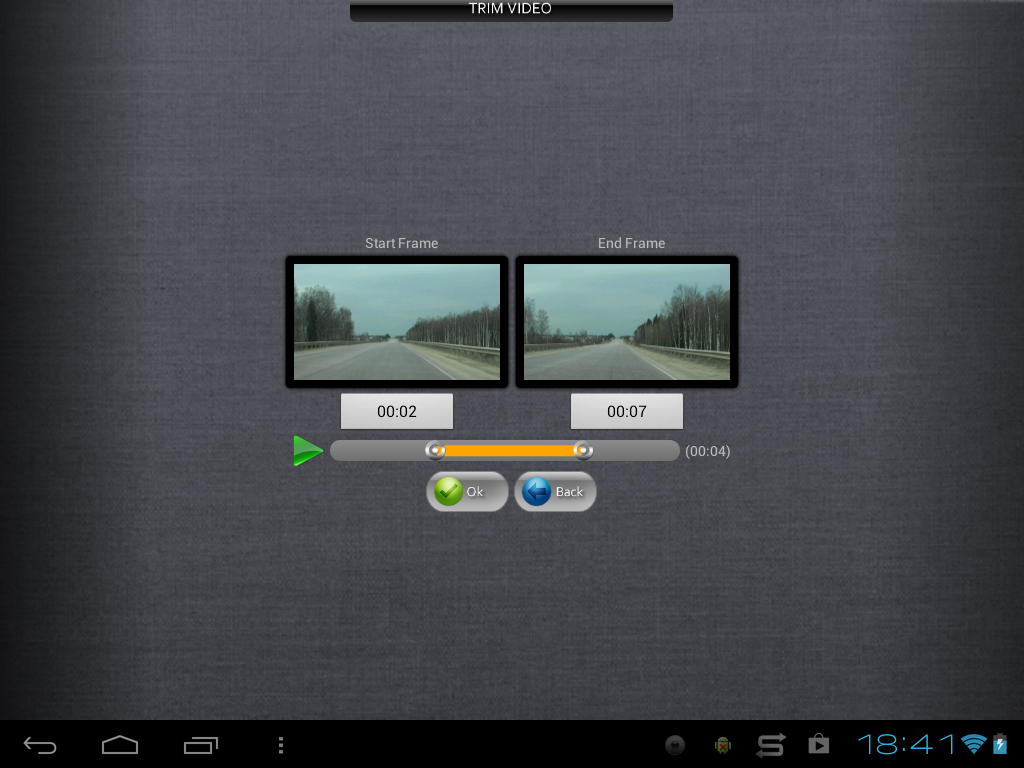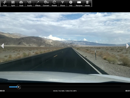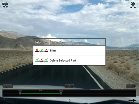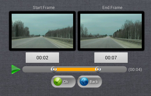 Вездесущие ножницы, триммер, или инструмент для подрезки выбранного файла. Ничего сложного. Здесь так же, как и в любом триммере, нужно перетащить границы начала и окончания клипа в нужные позиции. Приложение работает довольно шустро, текущее видео живенько воспроизводится синхронно с передвигаемыми границами, без подтормаживания. При нажатии на пиктограмму ножниц приложение ставит пользователя перед выбором: произвести обрезку оригинального файла (прежний файл будет заменен новым, подрезанным) либо сохранить вырезанный отрезок в качестве нового клипа.