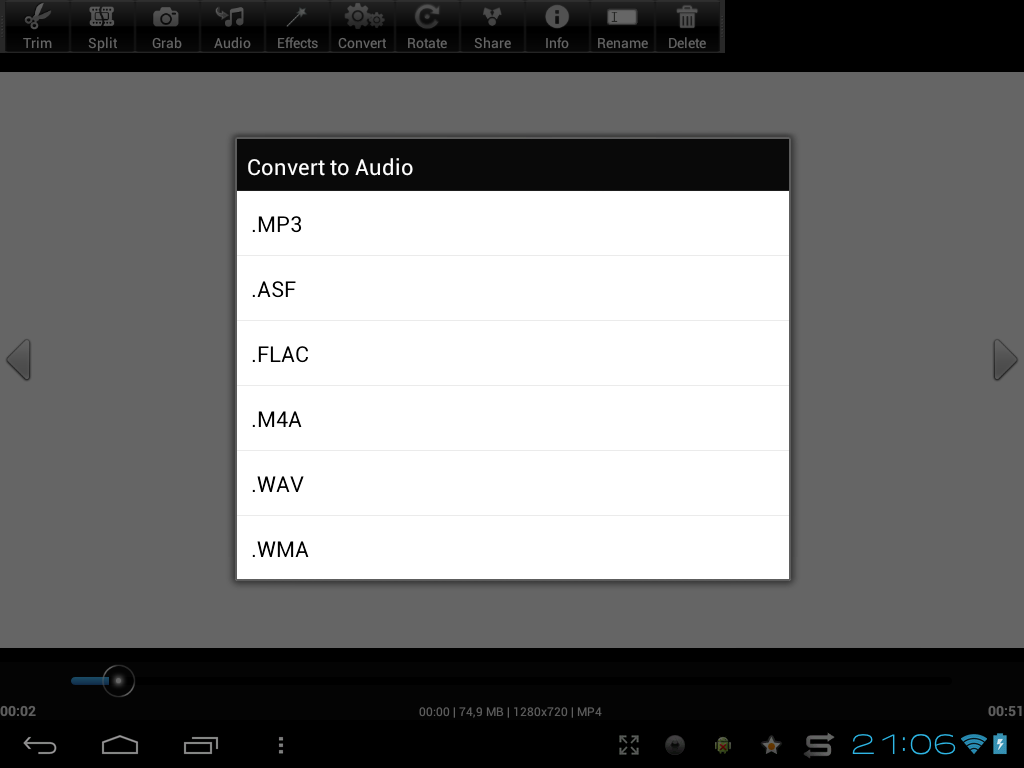 Trim, здесь предлагается закодировать звук видеофайла не только в MP3. На выбор имеются ещё такие форматы, как ASF, FLAC, M4A, WAV и WMA.
