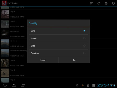 Галерее. Разницы между VidTrim и изученным выше AndroVid Pro Video Editor почти нет. За исключением, пожалуй, того факта, что данное приложение позволяет использовать различные режимы сортировки файлов в галерее: по дате, имени, размеру и длительности. Неплохое начало…