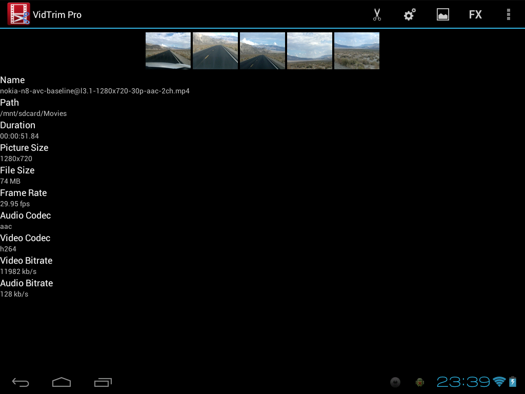 Щелчок по любому из видеофайлов немедленно запускает его воспроизведение. При этом в верхней части окна появляется строка из одиннадцати кнопок. Это, собственно, и есть интерфейс программы AndroVid Pro Video Editor.